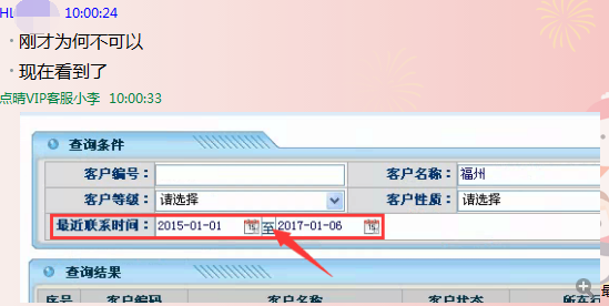 答:在对应的查询页面将“最近联系时间”、“最近拜访时间”范围调前一些