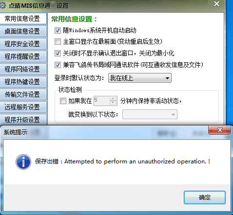 :设置点晴MIS信息通保存时报错:Attempted to perform an unauthorized operation,如何解决?