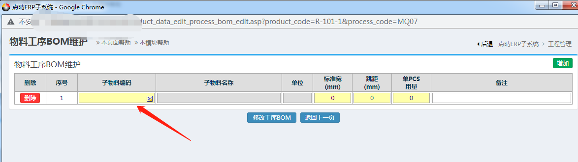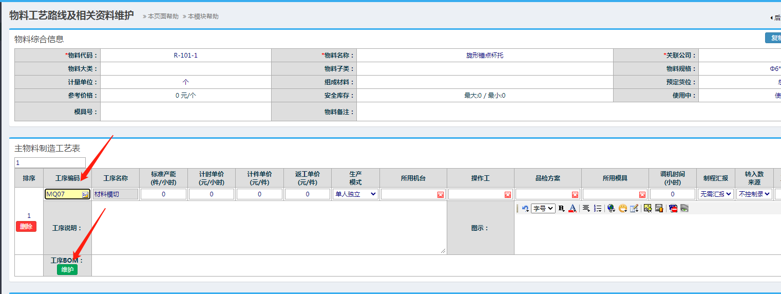 ![]() 进入界面,选择添加对应的工序工艺,之后在工序bom下点击维护按钮,如下图所示: