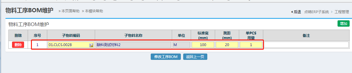 ![]() 填写完成后,点击修改工序BOM按钮完成,如下图所示