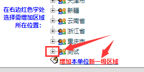 先等下方区域列表加载完毕,如果要新增第一级就点“增加本单位新一级区域”,如果要新增第二级,点击加号,再点“增加新第二级区域