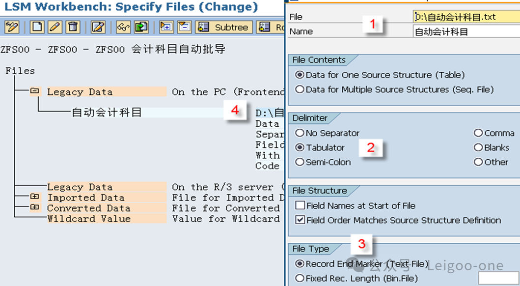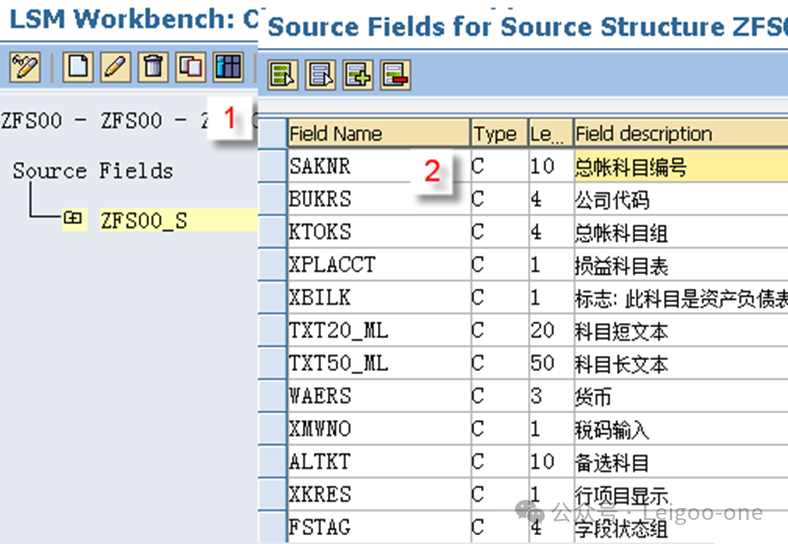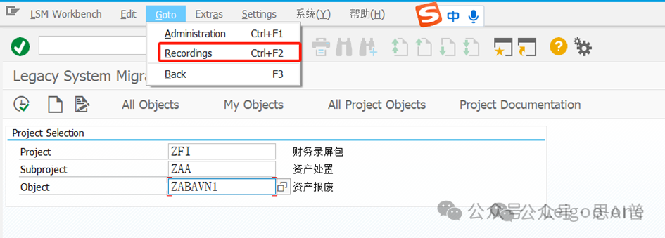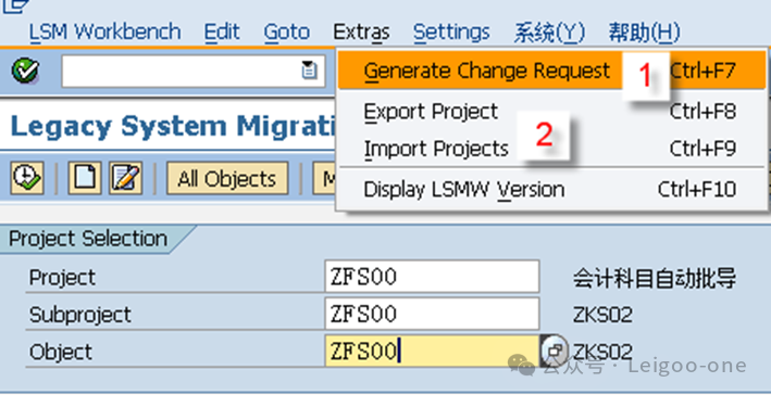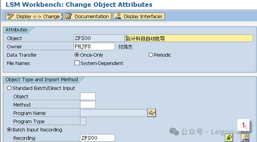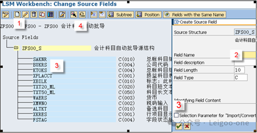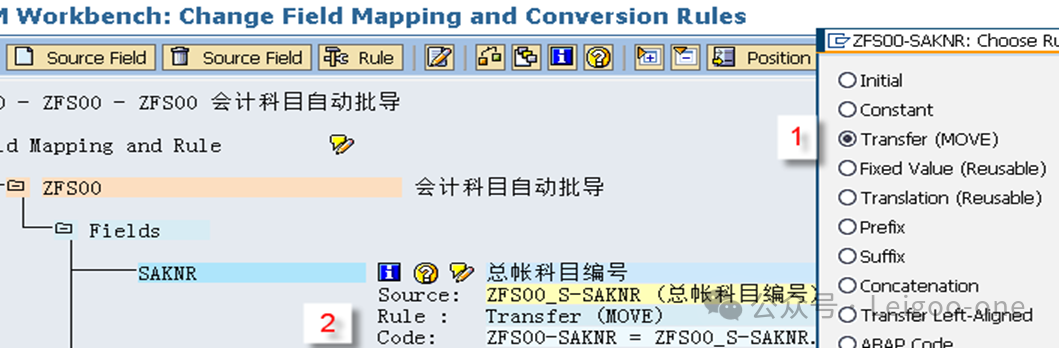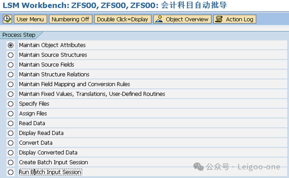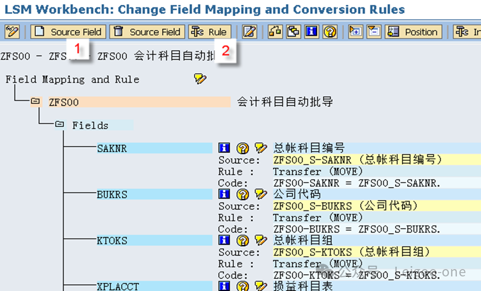 (1)CATT:Computer Aided Test Too (计算机辅助输入测试) (2)BDC:Batch Data Communication(批处理) (3)LSMW:legacy system Migration workbench(遗产系统迁移工作台) 对于一个新人,LSMW 的困难主要在于: 1、对LSMW本身的认识和理解 2、业务操作面的困难。 这个是在录屏的过程中使用具体的TCODE去进行实际业务处理的录屏过程方面的困难。 首先,有些事务码录屏时的界面和我们平时使用的界面并不完全一致,这就要求对前台的业务处理比较熟悉; 其次,录屏过程中可能会有很多的无关字段,甚至因为无关操作触发的更多无关的东西,如果对这些不够熟悉,则会在录屏结果中看到凌乱复杂的字段信息。 也就是说,在录屏前,你要基本保证自己对业务处理过程足够熟悉,且要精简,不要有过多无关操作,最后一定要触发保存;也就是说,你录屏时操作的一条数据,它本身应该是已经完成且保存了。另外,一个教训是,录屏时尽量选择直接手动输入录屏,避免复制,指SAP的复制功能,不是Ctrl+C/V,因为可能会丢失一些字段导致录屏失败。 以建立会计科目(Tcode:FS00)为例。执行事务代码:LSMW,如下图: ![]() 点击创建,输入project项目编码和描述;或者选择已有的项目,在已有项目下面创建。选择或者创建对应的子项目Subproject。创建项目包Object。 输入Project、Subproject和Object后,点“执行”按钮或回车,进入LSMW操作界面,可以看到LSMW共有14个单独步骤,从Maintain Object Attributes->Run Batch Input Session,如下图。接下来,按菜单操作就可以了。 ![]() 注:Project/Subproject/Object取名不能太长,否则在第7步”Specify Files”可能出现文件长度错误。 1、 Maintain Object Attributes第一步的主要任务实际上是创建录屏Recording。 ![]() 如上图,首先选择“Display<->Change”进入修改状态,再选择“Batch Input Recording”, 一定要在该字段填入Recording名,由于该Recording可能还并不存在,因此,需要选择上图的[1]的标志;或者,点击菜单go to--recordings,如图: ![]() go to recording后显示如下: ![]() 选择新建按钮,Recording输入“ZFS00“,确定后输入Tcode:FS00,开始录屏。 注:Recording输入的“ZFS00“就是Tcode:SM35显示的会话名称,在第13步”Create Batch Input Session”将产生这个会话。 ![]() 录屏结束后,如下图,系统自动列出操作所有操作屏幕和数据字段。 ![]() 双击数据字段,如科目,输入字段名称SAKNR(保持和SAP屏幕字段一致,也可叫KJKM)和数据字段描述。为批导涉及的所有字段都建立好字段名称和字段描述。 ![]() 注: (1)可以点”Default All”按钮取所有字段的默认值。 2、 Maintain Source Structures建立一个源结构。 ![]() 定义我们自己要以TXT文件提供的数据源的格式的名称,注意是数据源的名称,相当于一个结构的名称,不是文件名也不是字段名。接下来将为该结构建立批导字段。 3、 Maintain Source Fields定义数据源里面各个字段的名称和文本、长度等信息,相当于确定结构里的各个字段。 ![]() 如上图,按图-[1]的”新建”按钮,出现图-[2],填入字段名称、描述、长度和字段类型,假设批导需要上图-[3]的这些字段,则批导的Excel(最后可存为制表符为分割符的Txt文本)数据内容必须按这些字段的顺序组织,如果字段不对,可以使用上图-[4]的两个按钮调整顺序。 强调:最好保持Source Fields的顺序、录屏字段变量顺序和批导数据文件字段的先后顺序完全一致。 注:创建”Source Fields”,如果选上Selection Parameter for “imput/ConvertData”标志,表示该字段允许从批导文件上载时可根据该字段进行刷选。 一个批导excel数据组织示范图,可以看到和Source fields是按顺序一一对应的。 ![]() 上面的excel前2行为注释行,在第7步“Read Data”中可指定数据行从第3行开始,假设本例从第3行开始到第7行,共有5条数据记录行。 此步中,选择下图-[1]的”Table Maintenance”按钮,可看到如下图-[2]的集中维护方式。 ![]() 小技巧: 这里的字段长度必须大于实际表字段的长度,数据类型和长度最好匹配,要知道一个将批导字段的数据类型和长度,可以采用下面的3个步骤: (1)在操作屏幕对着该字段按”F1”帮助键,然后选择下图-[1]的。 ![]() (2)比如FS00操作界面的总账科目字段,可以看到它的字段名称叫SAKNR。 ![]() (3)双击字段名可以知道SAKNR的数据类型为10位的字符型。 ![]() 4、 Maintain Structure Relations定义录屏时产生的结构与我们在2和3自己定义的结构在结构名层级的对应关系,不涉及字段的对应关系,因为5才是字段的对应关系,相当于是SAP把结构名称和里面的字段分开来处理对应关系了。 ![]() 通常的数据迁移实例不应复杂,本例中,由于batch input recording只有1个,所以Source structure已自动默认分配。 5、 Maintain Field Mapping and Conversion Rules定义字段层面的对应关系。 首先,选择下图-[1]的“Source Field”,将批导字段变量和源结构的源字段关联上, 然后选择下图-[2]的”Rule”, 维护字段映射和转换规则,比如可以设置公司代码为有常数(Constant),如果公司代码固定,其实也可以直接在excel都输入固定公司代码。 ![]() Rule一般选择“Transfer(Move)”,表示字段到字段的移动,如下图。 ![]() 这步非常重要!!实际上这步是将录屏ZFS00时的数据字段和源结构做映射,由于源结构在第7步”Specify Files”中将关联上一外部批导数据组织文本文件,也就是说,数据组织文件的内容(字段)将和第3步“Maintain Source Fields”源结构的源字段关联,通过本步骤的映射,即批导录屏字段和外部组织文件的字段关联上了