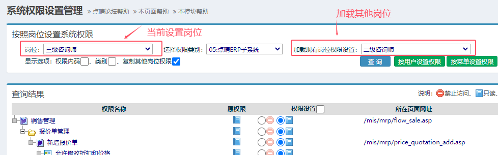 选择对应的岗位、权限类别后,系统会默认加载当前岗位的权限信息。当你需要复制其他岗位权限设置时,只需要在“加载其他岗位权限”中选择需要复制的岗位,即可加载其他岗位的权限信息。