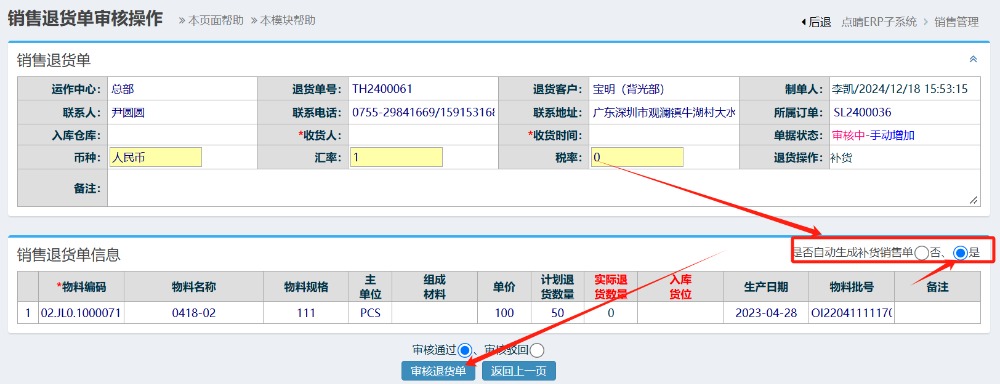 点晴模切ERP销售单退货自动形成补货销售订单操作注意事项