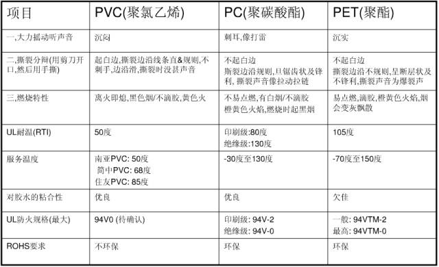 三、PVC、PC、PET绝缘片的性能对比: