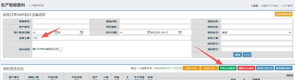 操作步骤:生产管理-单级BOM排产-工单智能备料