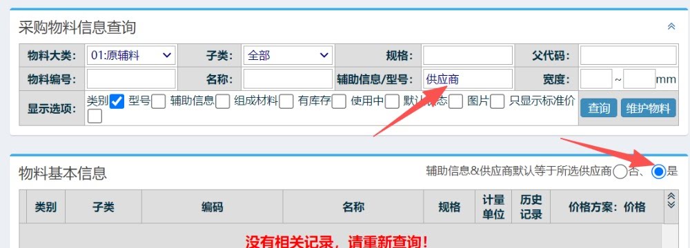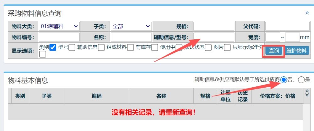 在操作采购下单时,会出现查询不到任何物料情况,如下图