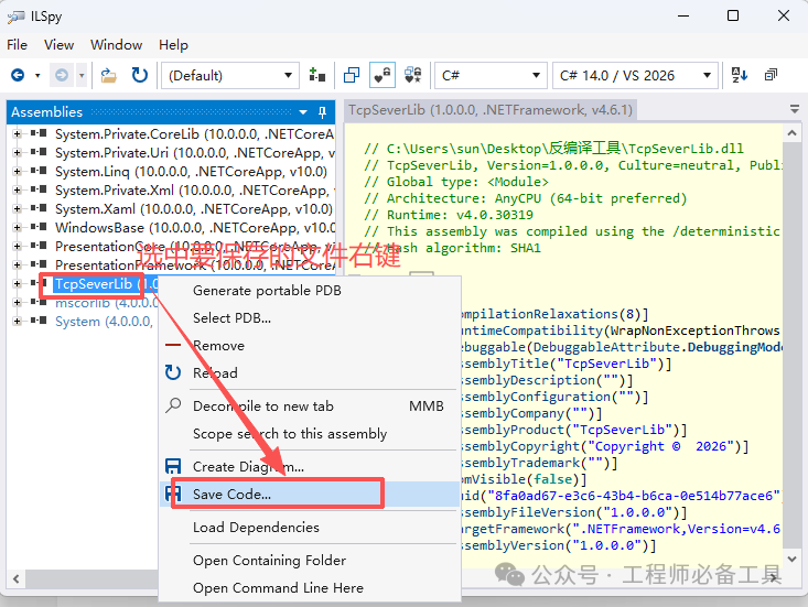 接下来我们来演示下如何用ILSpy在5分钟内,将.dll/.exe文件反编译成完整C#代码。这里以之前文章中写的TCP服务端的库演示,跟着做就能成功。