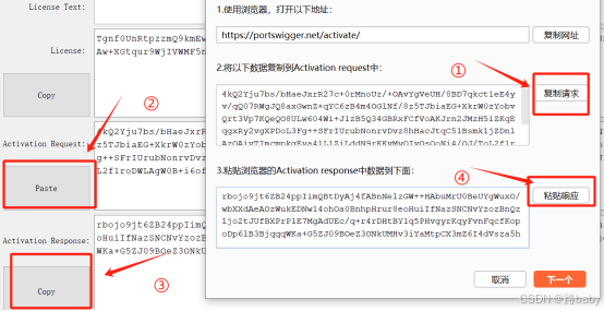 随后按照下图步骤将burp第二步给的秘钥粘贴进注册机 并将注册机生成的最后的秘钥粘贴进burp 按照下图步骤进行 然后点击下一个