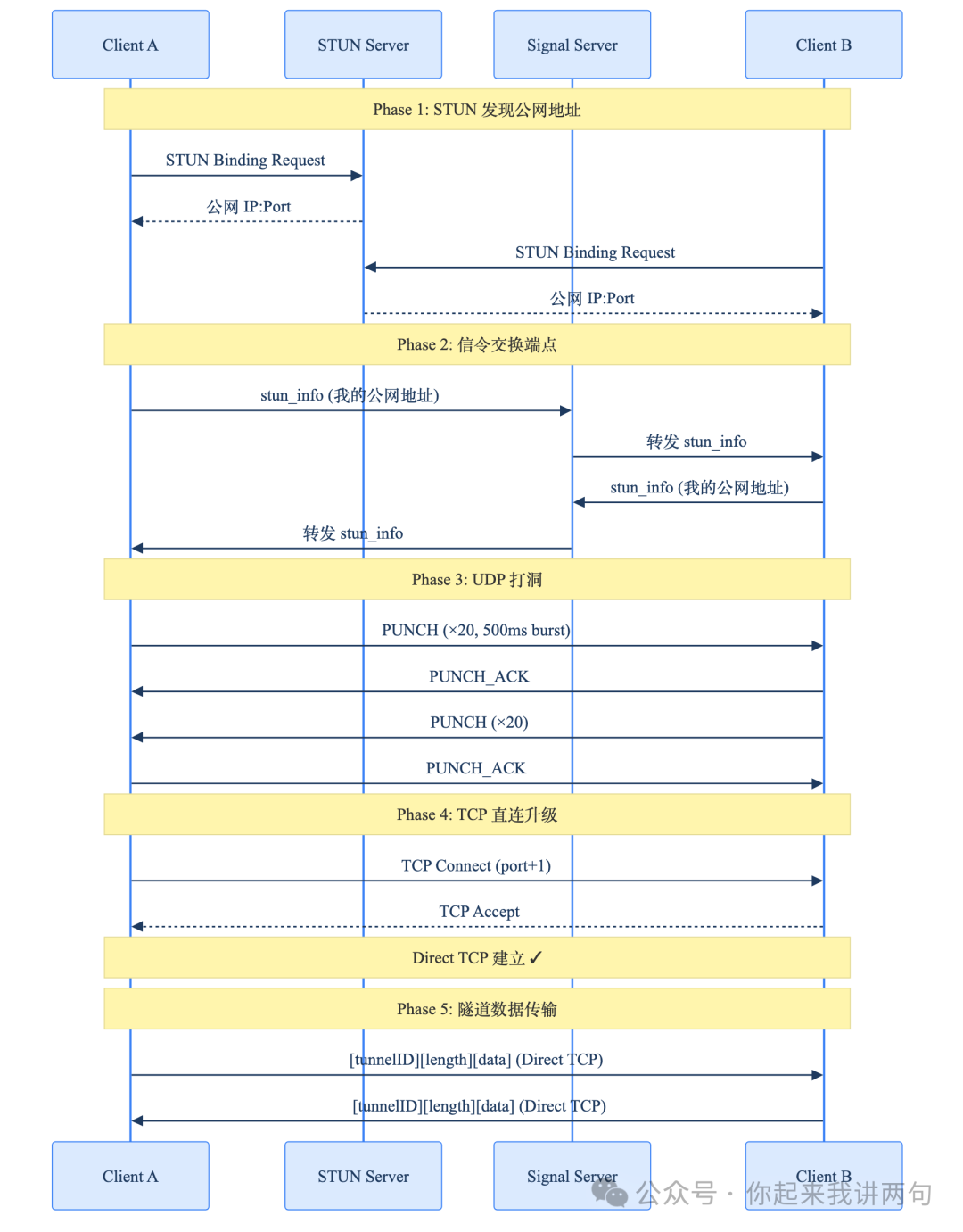 ▲ 图 1:STUN Max 整体架构 打洞是怎么实现的 NAT 穿透这事,说起来简单,做起来全是坑。我的方案分四步: 第一步:STUN 发现公网地址 每个 client 启动后,向 STUN 服务器发一个 UDP 包。STUN 服务器告诉你:「外面的世界看到你的地址是 1.2.3.4:5678」。这就是你的公网映射地址。 第二步:交换端点 + 打洞 两个 client 通过信令服务器交换各自的公网地址,然后同时向对方发 UDP 包。这就是经典的「UDP Hole Punching」—— 双方同时往对方的 NAT 上「戳洞」。 我做了一些优化:20 个 PUNCH 包 / 500ms 快速突发,对 Symmetric NAT 还会用 Birthday Attack(8 个额外 socket 并行打洞)和端口预测。 第三步:TCP 直连升级 这是我踩了最多坑才想明白的一步。一开始我直接用 UDP 传隧道数据,结果丢包、乱序、加密竞态,各种问题。 UDP 不保证顺序,不保证到达。用它传 TCP 流数据,就像用卡车运水——洒一路。 最终方案:UDP 打洞成功后,在同一个 NAT 映射上建立 Direct TCP 连接。TCP 天然提供可靠传输 + 有序 + 流控。隧道数据走这条 TCP,稳如老狗。 第四步:自动 Relay 兜底 如果打洞失败(比如双方都是 Symmetric NAT),数据自动走 WebSocket Relay 中继。用户无感知,只是速度慢一点。