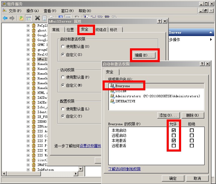 hMailServer的组件权限要也要设置成everyone或IIS来宾权限。服务器组件权限修改:Windows开始-->控制面板-->管理工具-->组件服务-->计算机-》我的电脑-》DCOM配置-》HMailserver组件,右键:“启动和激活”与“访问权限”项自定义增加everyone或IIS来宾权限。
