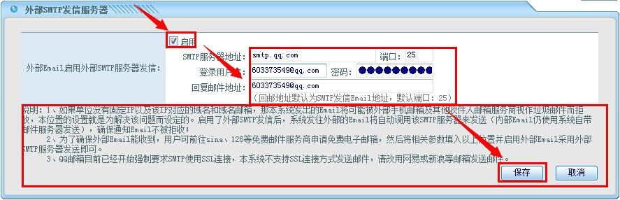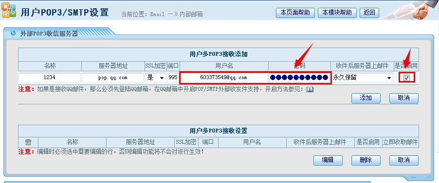 开启SMTP填入对应账号密码,填入POP对应账号密码;如下图所示: