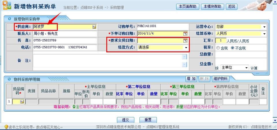 操作步骤:采购管理——采购单管理——新增采购订单;进入页面如下图所示: