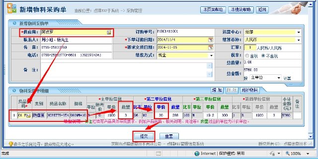 选中物料之后,填入对应的价格与数量;比如按平方计价20元每平方,需采购三卷,则填写的方式如下图所示: