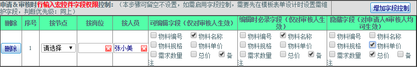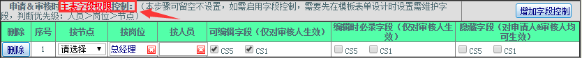 操作步骤:点击“增加字段控制”按钮——选择执行的节点(岗位,人员)——字段的编辑设置;如下图示: