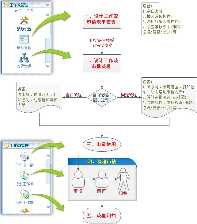 6、流程分为固定流程自由流程两种,固定流程由固定步骤组成,用户事先需定义好,自由流程无需定义流程步骤,由申请人指定审核路线。