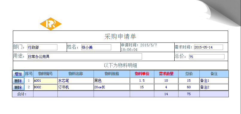 操作步骤:登陆点晴oa ——工作流申请——选择“采购申请单”进行申请;填好数据后如下图所示: