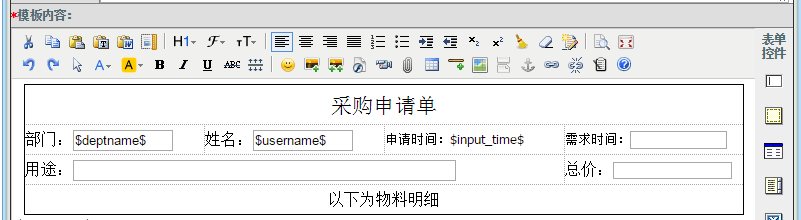 1、点晴OA中没有提供直接的附件上传控件,需要在申请的表单中插入富文本控件,用户申请工作流时,通过富文本编辑器插入附件的方式实现附件的上传。注意,富文本控件要放在表格中,不要单独放在一行,否则将导致审核时,审核人在IE浏览器中将无法看到附件: