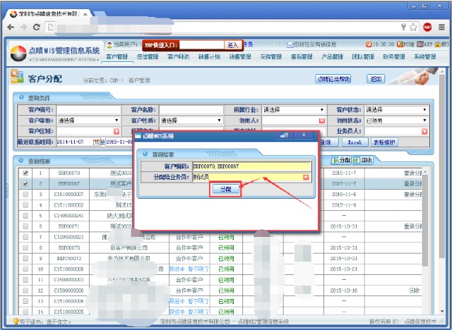操作步骤:客户管理——客户领用——客户分配——选择目标客户——点击分配按钮;如下图所示: