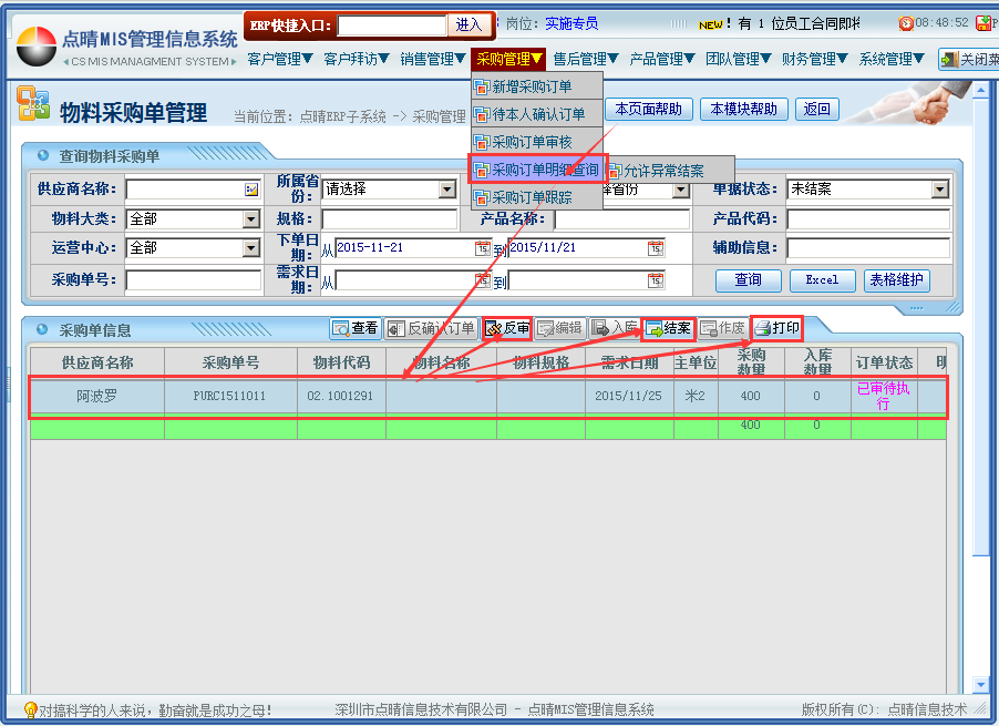 操作步骤:采购管理——采购订单明细查询——选择对应的单据——点击按钮进行操作;如下图所示: