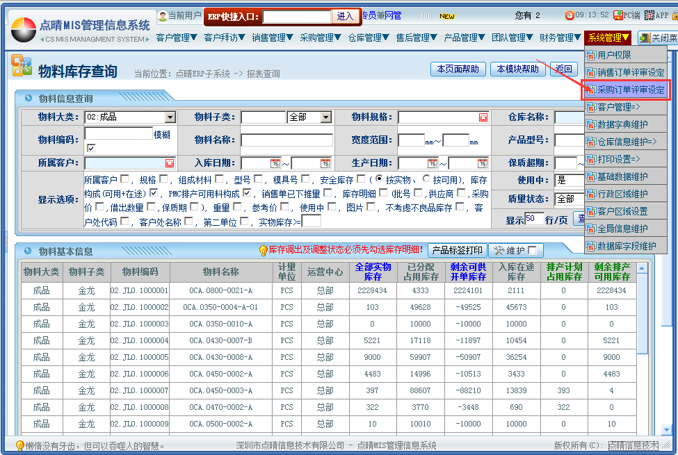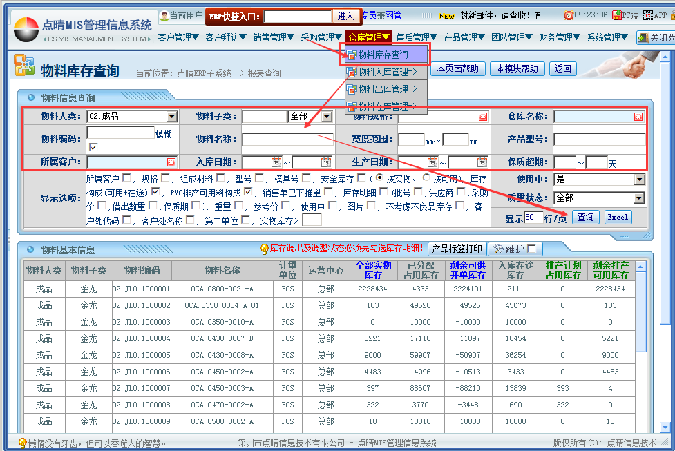 操作步骤:仓库管理——物料库存查询——录入查询条件——点击“查询”按钮