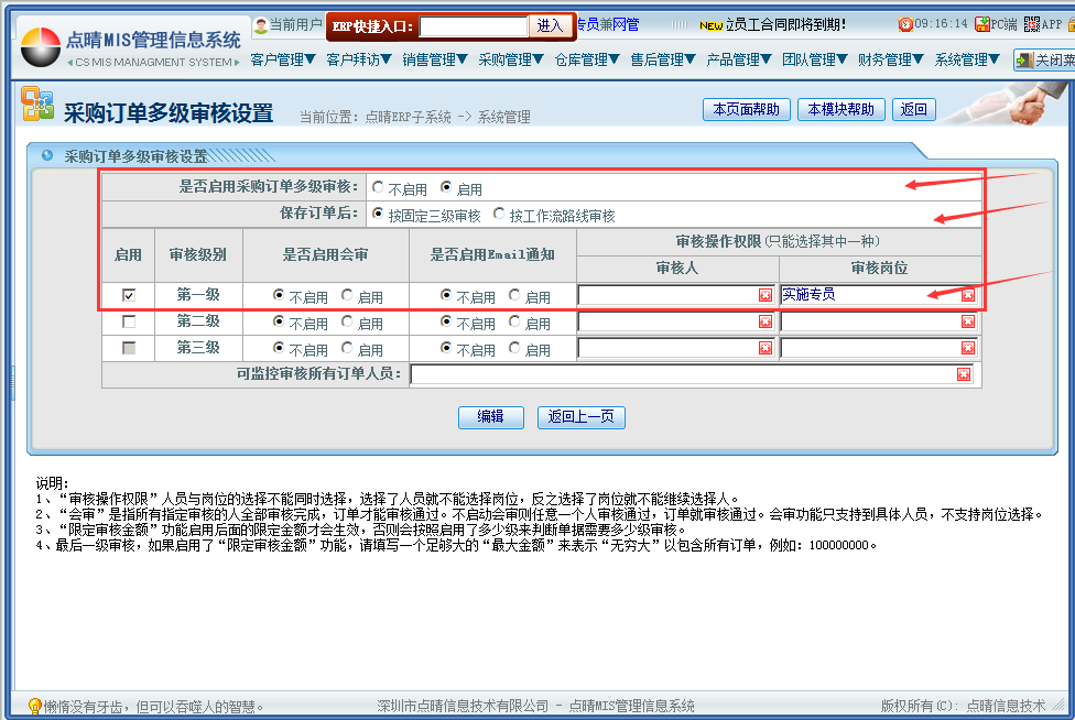 操作步骤:系统管理——采购订单评审设定;如下图: