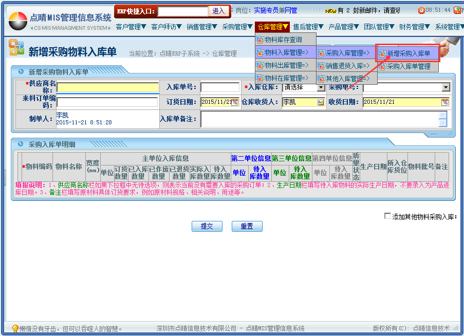 操作步骤:仓库管理——物料入库管理——采购入库管理——新增采购入库单;如下图: