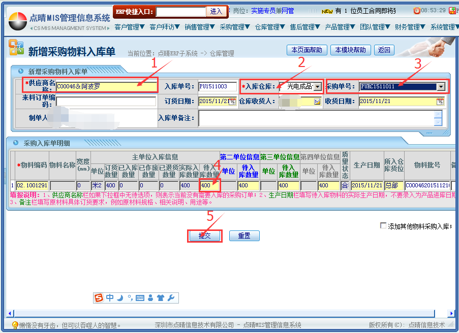 进入操作页面:1、填(选)供应商名称;2、选择仓库;3、选择采购单号;4、核对明细并录入库存数据;5、提交