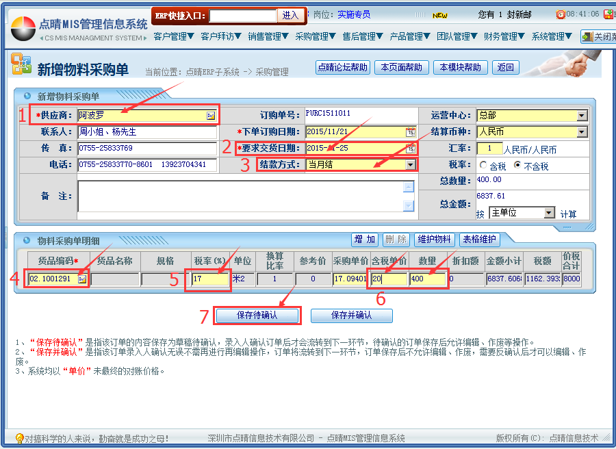 操作步骤:1、录入供应商;2、录入交货日期;3、选择结款方式;4、选择货品编号;5、填写税率; 6、录入价格;7、点击“提交待确认”按钮或者“保存并确认按钮”
