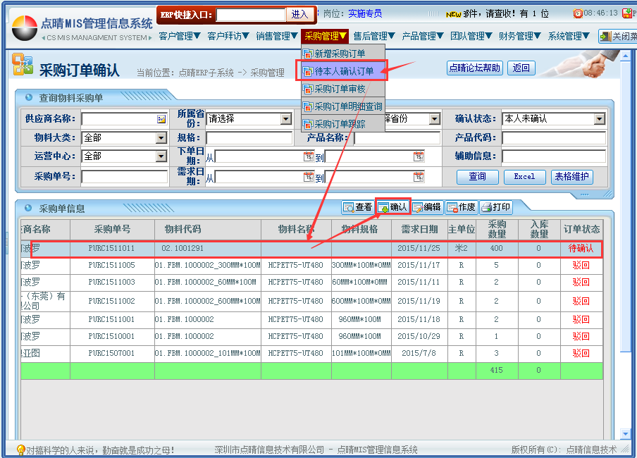 操作步骤:采购管理——待本人确认订单——选择订单——点击“确认”按钮;如下图所示: