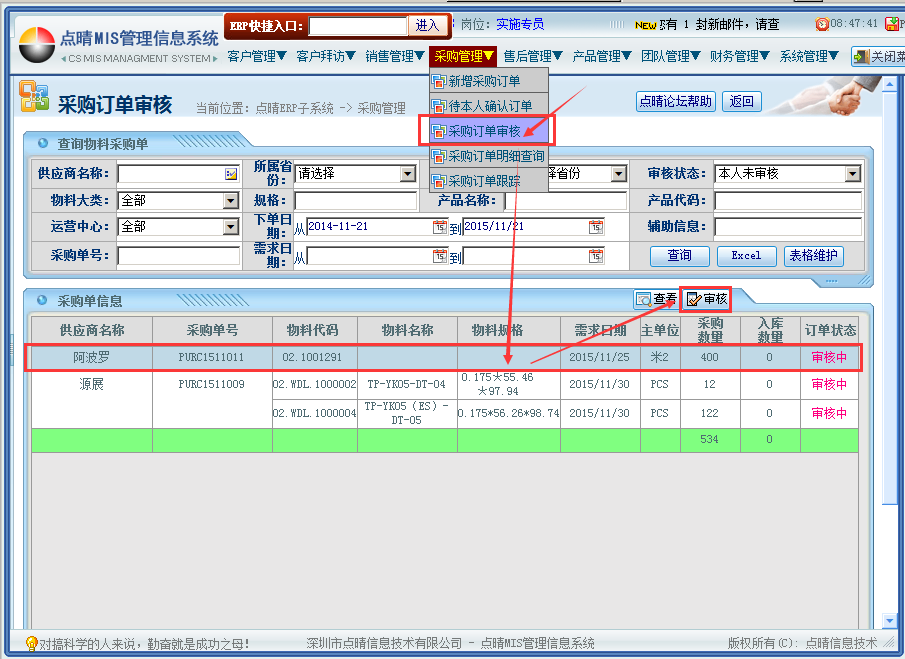 操作步骤:采购管理——采购订单审核——选择对应采购单——点击“审核”按钮;如下图所示: