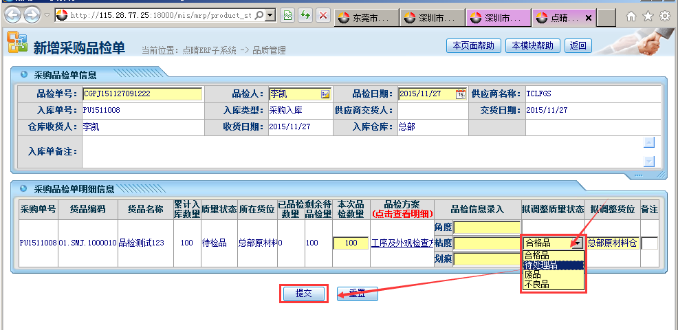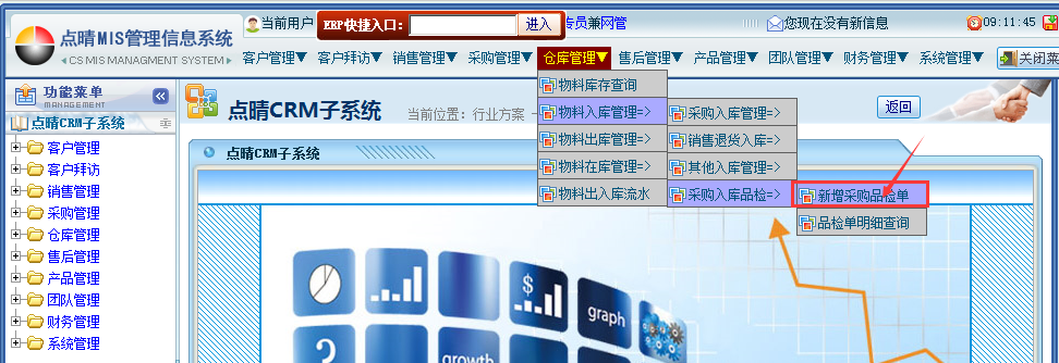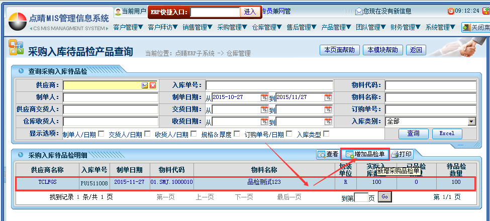 操作步骤:仓库管理——物料入库管理——采购入库品检——新增采购品检单;如下图: