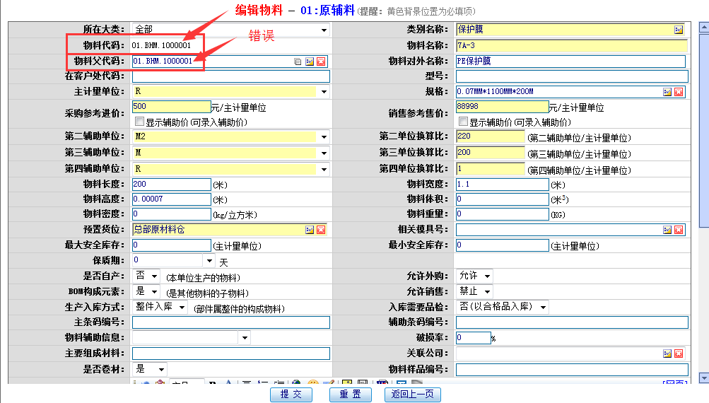 原因2:对应材料有库存,但材料基础资料绑定父代码错误;如下图所示: