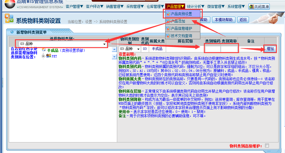 操作:产品管理——产品类别设置——选择品种——录入类别编码与类别简称——点击“增加”按钮;如下图所示: