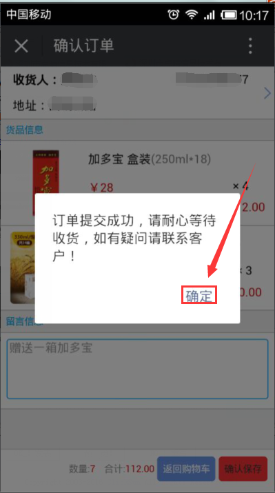 继续点击“确认保存”按钮完成订单提交;如下图所示: