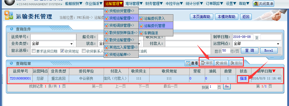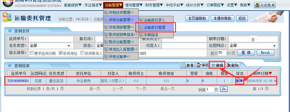 操作步骤:运输管理——货柜运输管理——运输委托管理——选择对应的“制单”状态单据——点击编辑按钮;如下图所示: