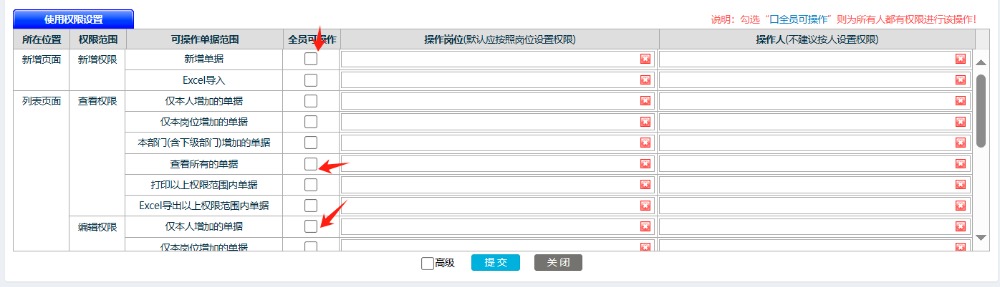 在页面设计最下方,有用户权限分配的勾选项,一般新增,查看权限为所有人的,其他都是本人的单据才允许操作如下图: