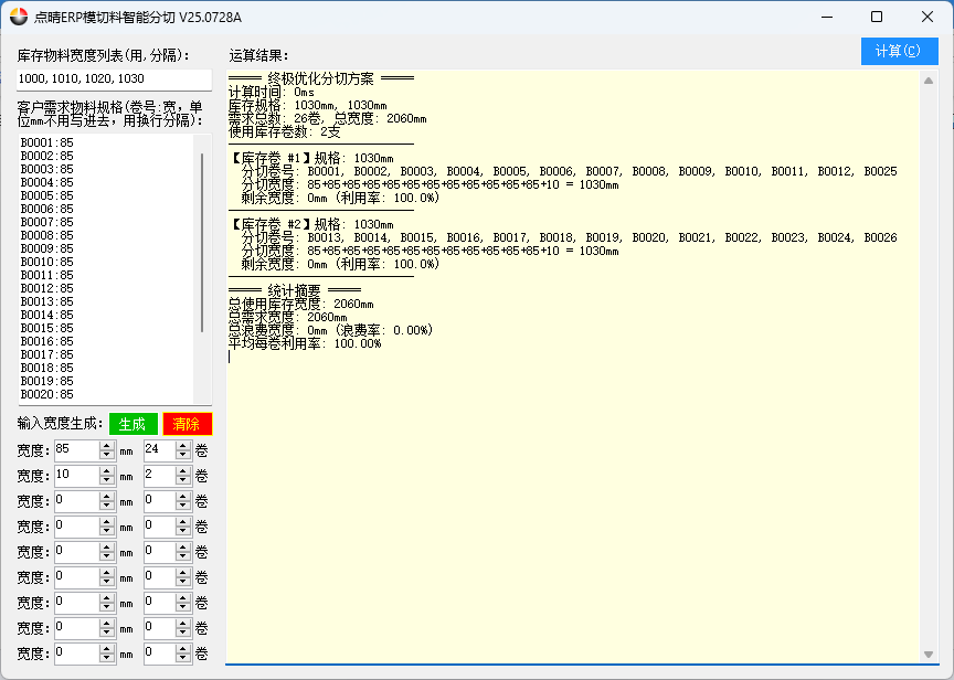 在贸易型模切材料销售企业中,往往会面临客户下单规格多样,仓库中库存材料也存在多种规格,如何最佳利用仓库现有库存来最优分切客户需求的物料规格,实现最少分切卷数、最小浪费材料的目标,是一个老大难问题,看人工很难实现精确的最佳用料分切运算,只能根据经办员工的个人经验来做出大致的判断,无法知道是否是最优解,下面的代码可以有效解...
