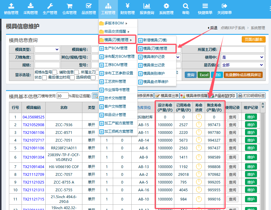 【点晴模切ERP】请问模具寿命统计在哪里可以查询到?在工程管理-》模具(刀模)管理-》模具(刀模)管理中,可以看到各个刀模的使用情况统计:​