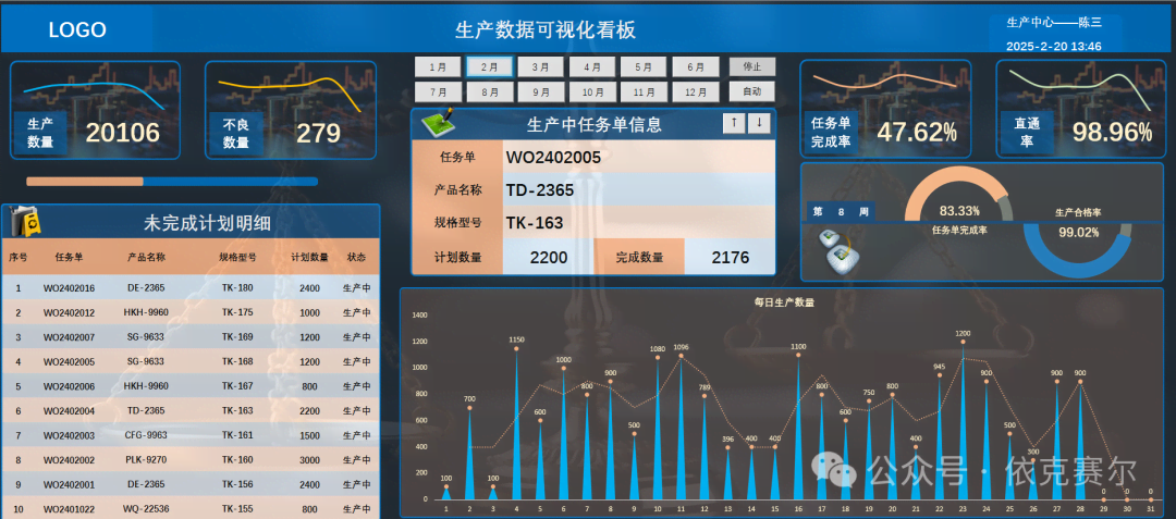 生产数据可视化看板生产数据可视化看板3.5:生产数据可视化看板是一种直观、高效的工具,旨在帮助企业实时监控和分析生产过程中的关键数据。通过将复杂的生产数据转化为图表、动态图形,管理者能够快速掌握生产线的运行状态、设备效率、产品质量以及资源消耗等核心指标。看板支持多维度数据分析,帮助识别生产瓶颈、优化资源配置、提升生产效...