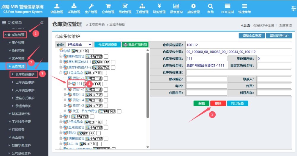 以管理员身份登录点晴ERP系统,进入:系统管理-》仓库管理-》仓库货位维护然后选中需要删除的货位,点击货位名称,然后在右边会出现此货位详细信息,然后点击“删除”按钮即可。
