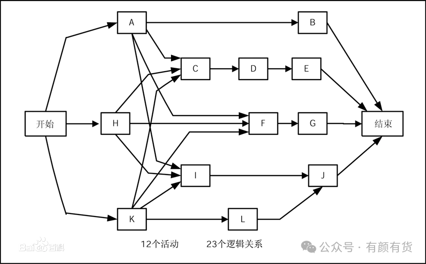 利用节点表示活动(Active),用箭线(Arrow)表示活动排序的一种编制项目网络图的方法,这种方法也叫做单代号网络图(Active On the Node,简称AON)。这种方法中,每项活动由唯一的活动号,每项活动都注明了预计工期。通常,每个节点的活动会有如下几个时间:最早开始时间(ES),最迟开始时间(LS),最早结束时间(SF),最迟结束时间(LF)。
